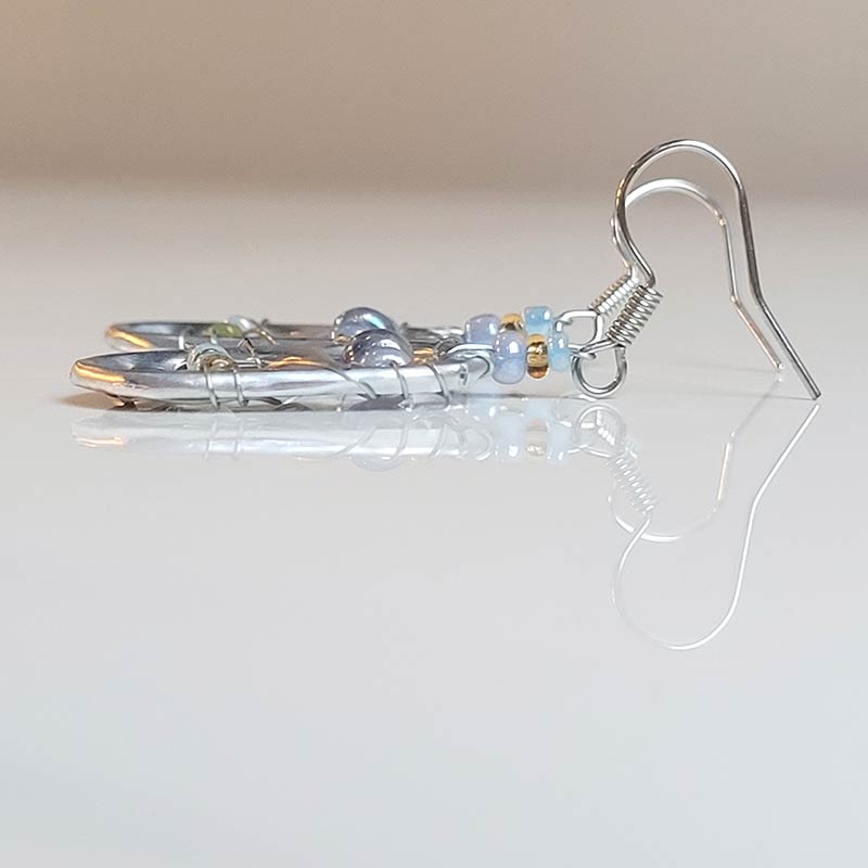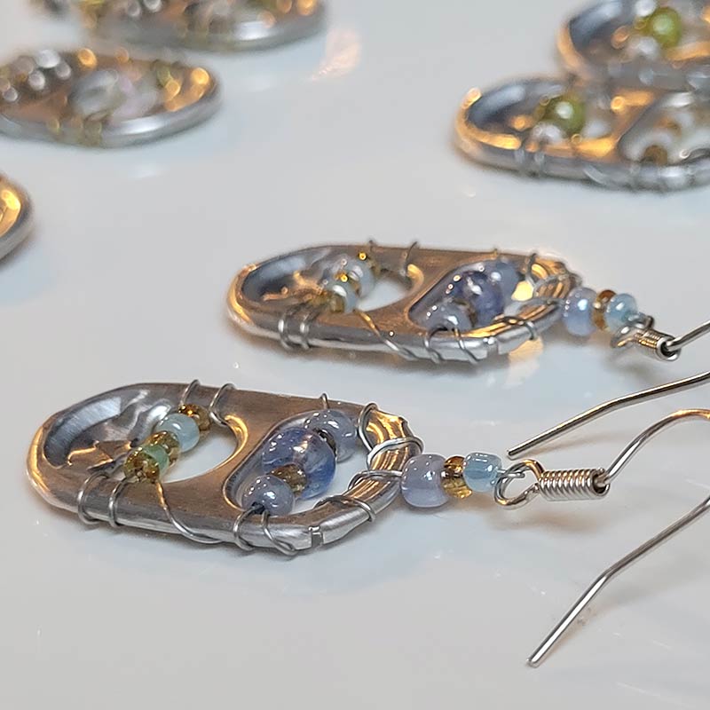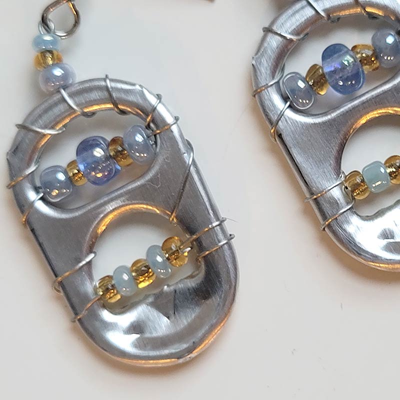 These upcycled earrings give discarded pop tabs a second life, turning them into something stylish, unexpected, and fun. Each tab is carefully cleaned and wrapped with wire and colourful blue and gold toned beads to create lightweight earrings that celebrate creativity and sustainable fashion.