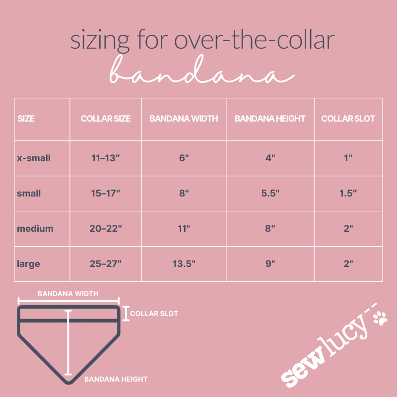 Designed to slide onto your dog’s collar, this handmade dog bandana stays in place for everyday wear or special occasions. Finished with top-stitching with double-hemmed edges for a clean, polished look. Shown on a 65 lb Golden Retriever wearing a size Medium.