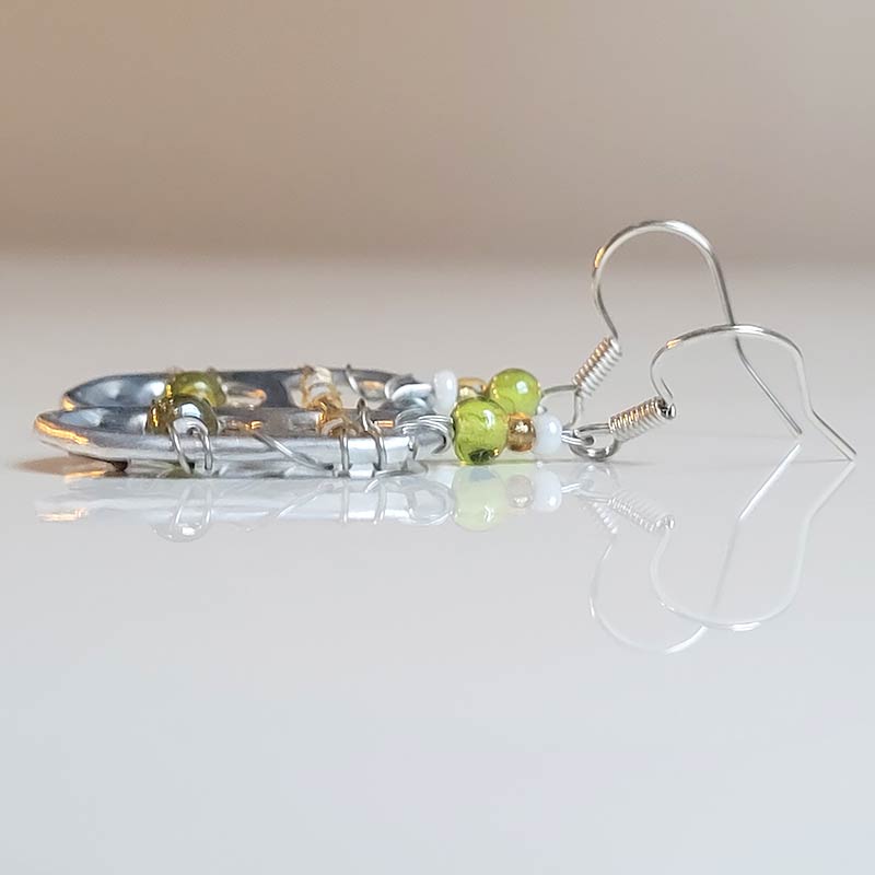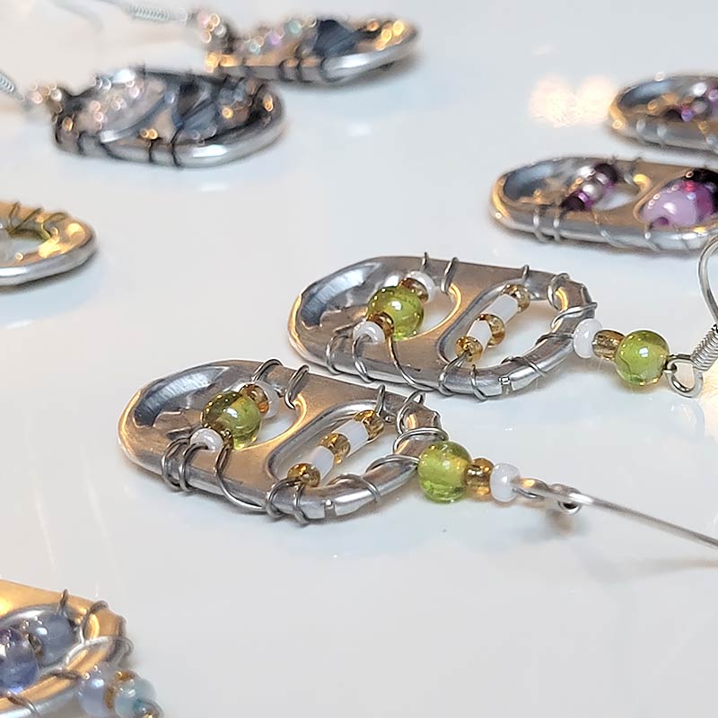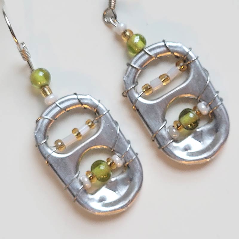 These upcycled earrings give discarded pop tabs a second life, turning them into something stylish, unexpected, and fun. Each tab is carefully cleaned and wrapped with wire and colourful green, gold and white toned beads to create lightweight earrings that celebrate creativity and sustainable fashion.