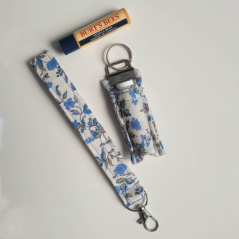 Keep your chapstick within reach with this handmade lip balm holder in a vintage blue floral print fabric. A sturdy ring clip attaches easily to keys, bags, or belt loops, making it a practical and stylish everyday essential. Fits standard size lip balm or chapstick tubes (Burt’s Bees and ChapStick)
