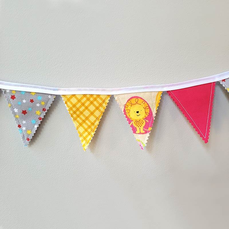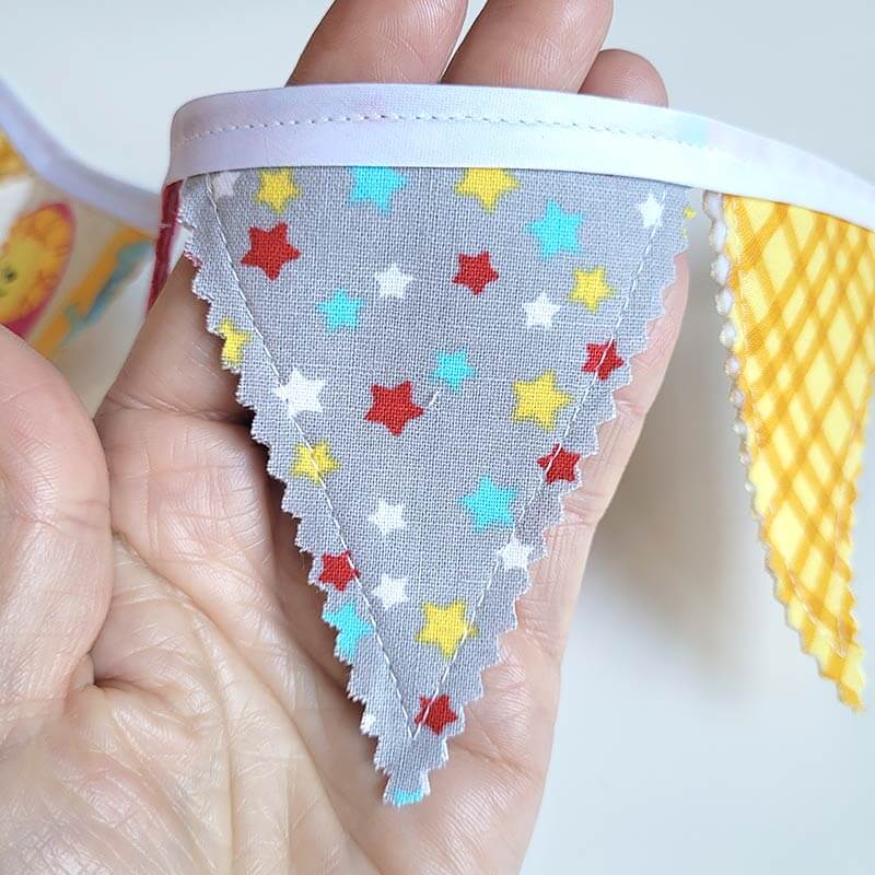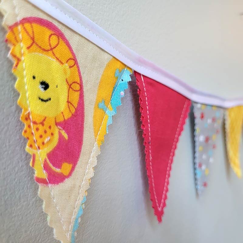 Each garland has four coordinating bright fabric colors, with flags measuring 3″ × 3.5″. The flags are double-sided, reinforced with interfacing for durability, and finished with bias tape.