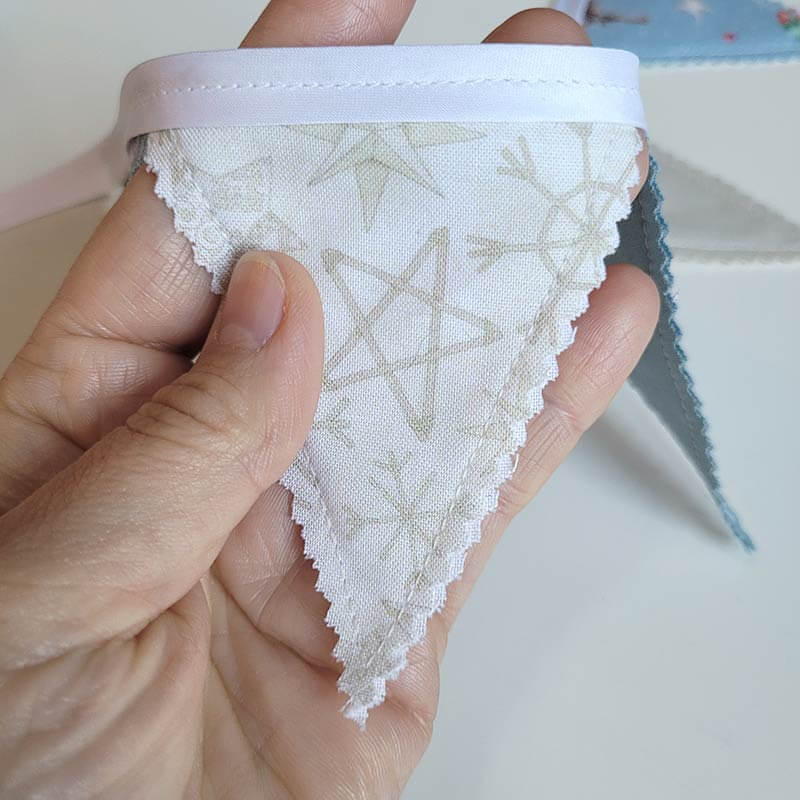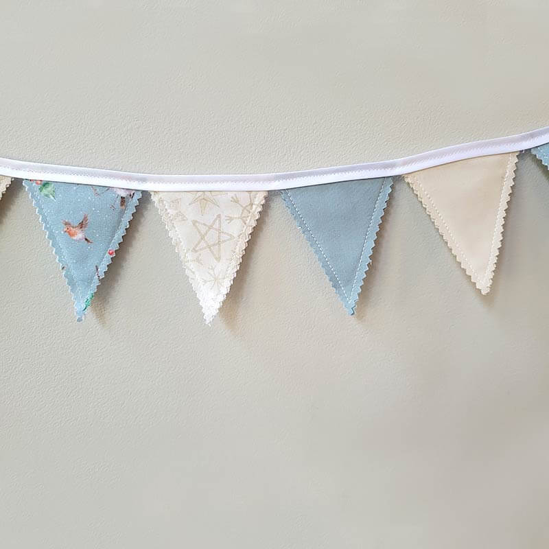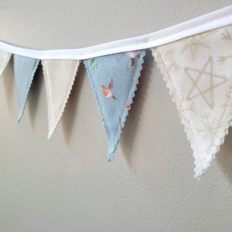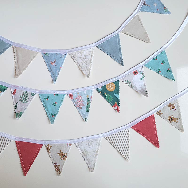 Each garland has four coordinating neutral fabric colors with Christmas patterns, with flags measuring 3″ × 3.5″. The flags are double-sided, reinforced with interfacing for durability, and finished with bias tape.