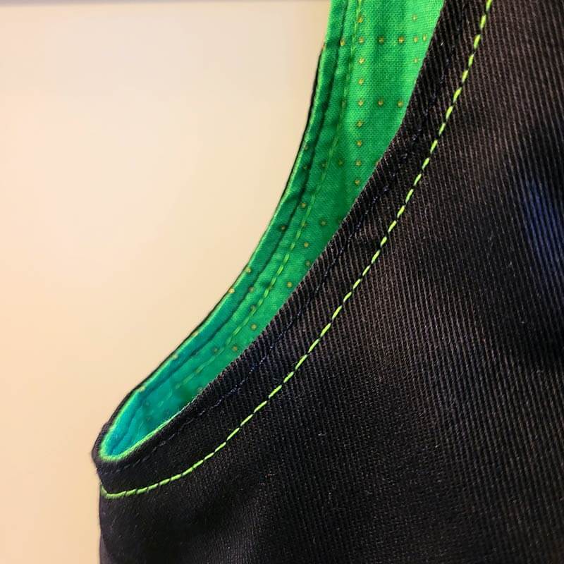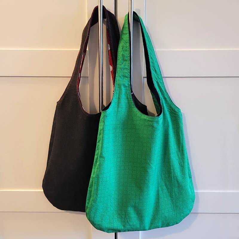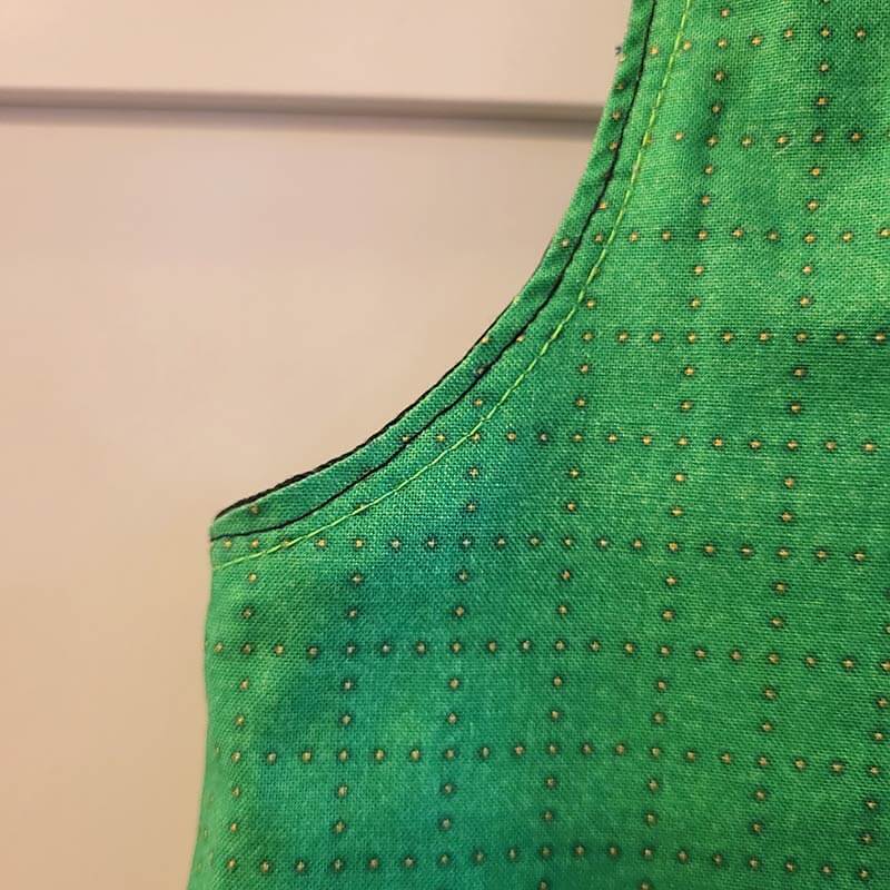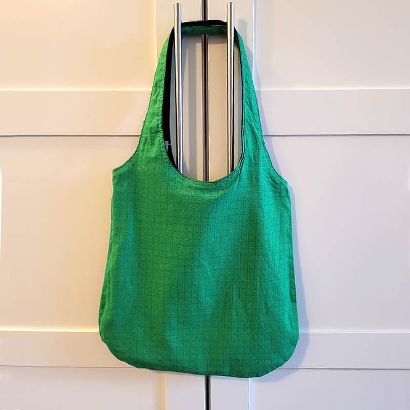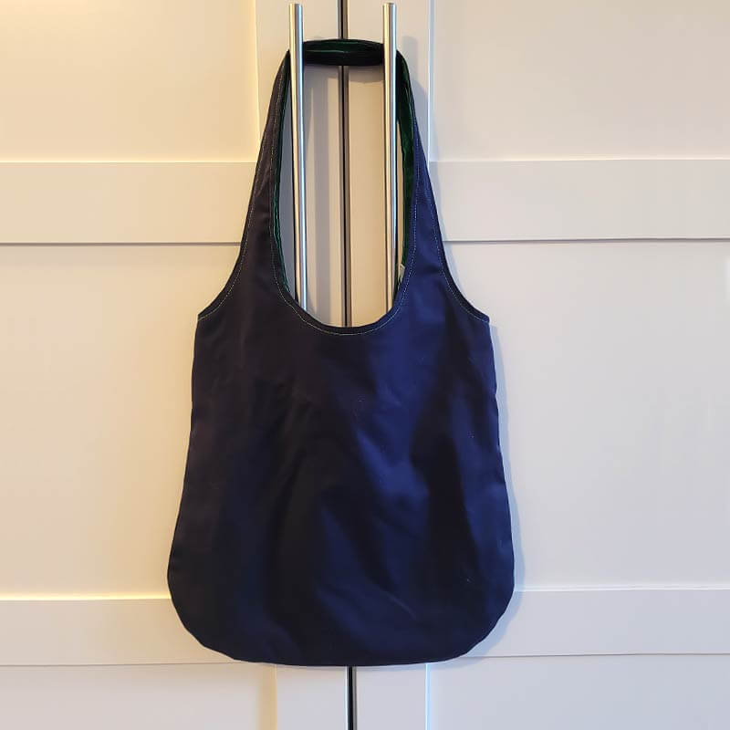 A practical and versatile over-the-shoulder tote. Use it for books, groceries, or everyday essentials, then flip it inside out for a fresh look. One side is classic navy, the other a kelly green dotted pattern with matching stitching—completely reversible for two styles in one.