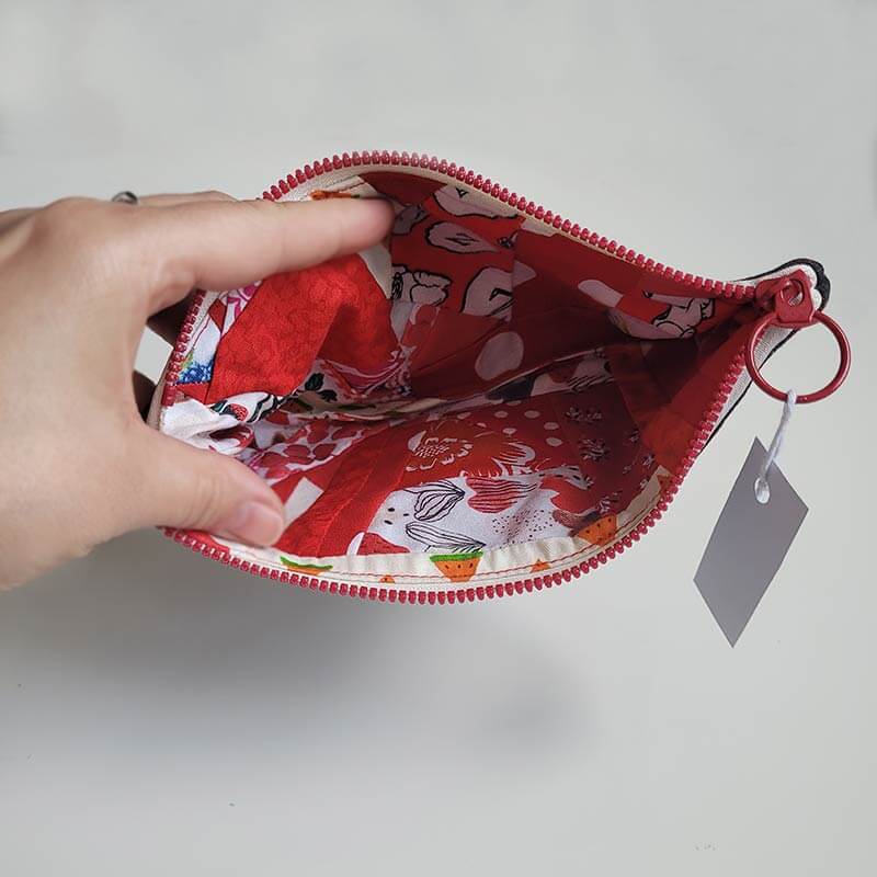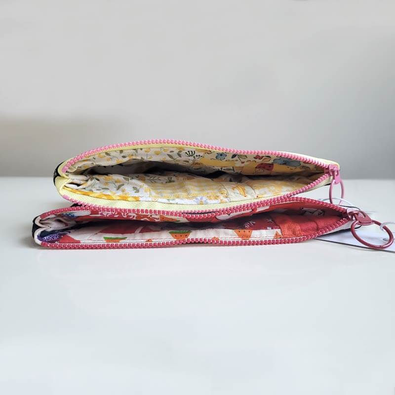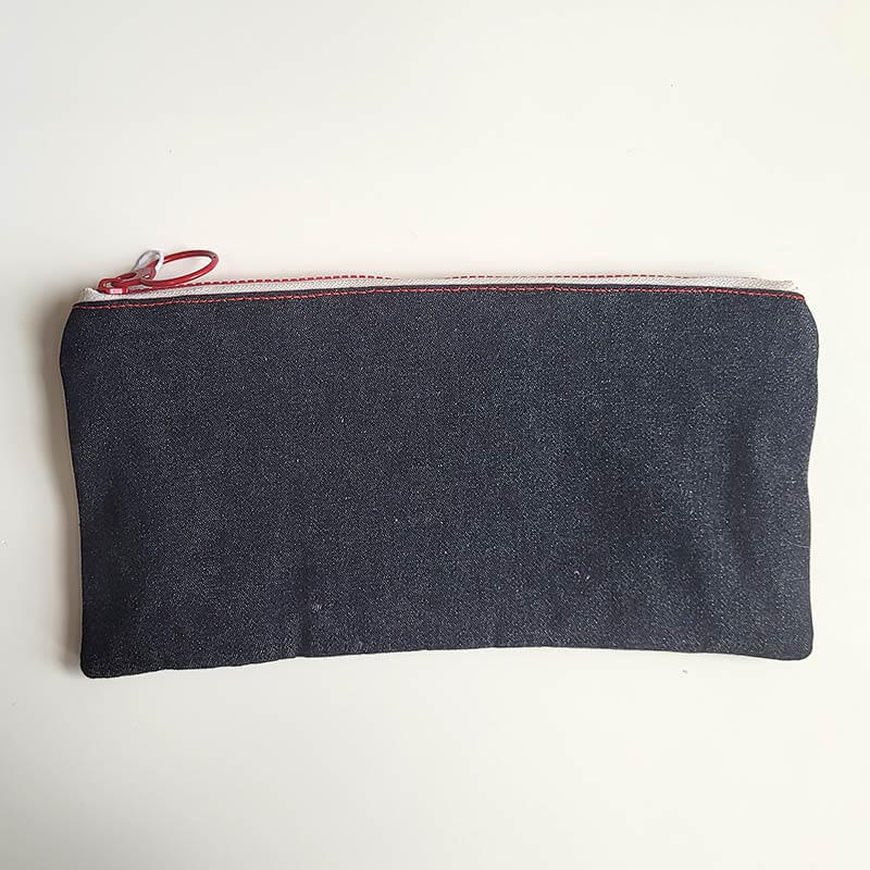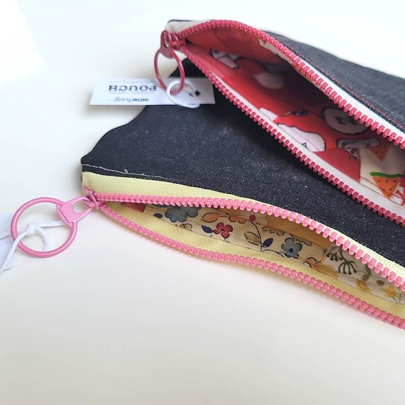 The Scrappy Zipper Pouch is a durable, handheld denim bag featuring a cute zipper with an easy-pull ring. The fun zipper colour matches the vibrant, one-of-a-kind patchwork lining inside – stitched from coordinating fabric scraps for a colourful surprise each time you open it. Sturdy, stylish, and perfect for everyday essentials, from art supplies to makeup and jewellery.